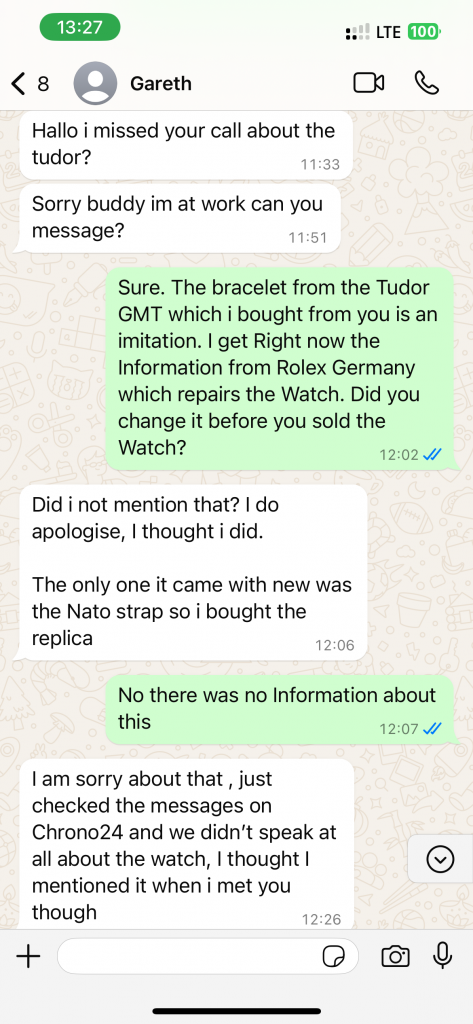 Did Chrono24 accept the fraud? No, they kicked him out as an seller, cause they advised him to pay the full amount of an original Tudor bracelet, but he didn’t respond. Chrono24 doesn’t accept scammers on their business.